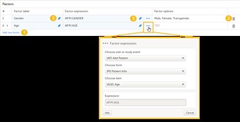 - Factor expression - This is a mandatory field. Here you choose to map the factor to a particular form item. You can either type in the expression for the respective item or click ... and the Factor expression dialog opens.