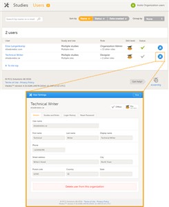 - The User Settings window displays whether the user is online, and the experience that the user has. The User Settings window has the following tabs: • Details, read-only information about the user’s name and contact details. • Studies and Roles, a list of sites and roles the user has access to. • Login History, a list of the logins for the respective user, including date and time, the IP address, and the browser that was used for logging in. The number of displayed entries is limited to the latest 100 logins. • Reset Password, used to reset the password for a user (see chapter 9).
