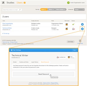 - The User Settings window displays whether the user is online, and the experience that the user has. The User Settings window has the following tabs: • Details, read-only information about the user’s name and contact details. • Studies and Roles, a list of sites and roles the user has access to. • Login History, a list of all logins by that user, including date and time, the IP address, and the browser that was used for logging in. • Reset Password, used to reset the password for a user (see chapter 9).